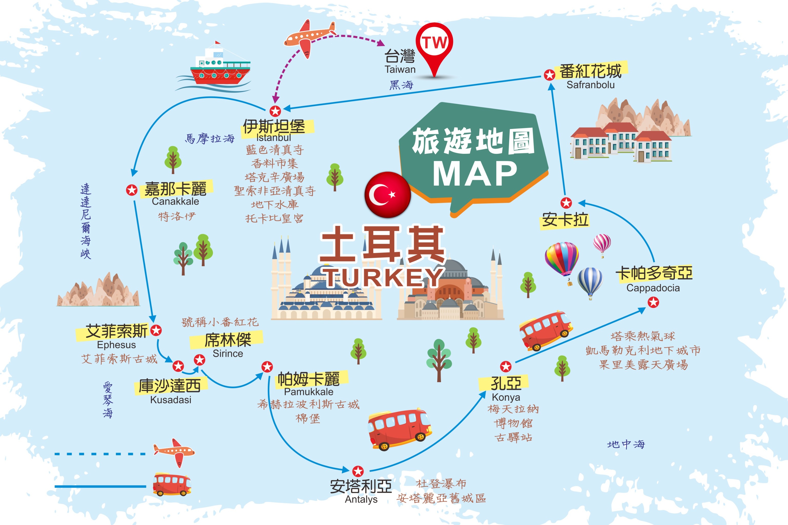 ※特洛伊遺跡 ※艾菲索斯古城 ※聖母瑪莉亞之家 ※棉堡及希拉波里斯古城 ※安塔利亞舊城區 ※梅夫拉那清真寺博物館 ※凱馬克勒地下城市 ※葛萊梅露天博物館 ※安那托利亞文明博物館 ※凱莫爾記念館 ※番紅花城 ※托卡比皇宮及珍寶室 ※古羅馬地下水庫 ※藍色清真寺 ※博斯普魯斯海峽遊船※ 圖茲湖/鹽湖