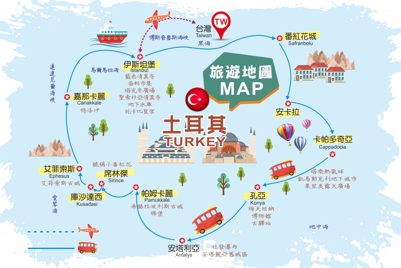※特洛伊遺跡 ※艾菲索斯古城 ※聖母瑪莉亞之家 ※棉堡及希拉波里斯古城 ※安塔利亞舊城區 ※梅夫拉那清真寺博物館 ※凱馬克勒地下城市 ※葛萊梅露天博物館 ※安那托利亞文明博物館 ※凱莫爾記念館 ※番紅花城 ※托卡比皇宮及珍寶室 ※古羅馬地下水庫 ※藍色清真寺 ※博斯普魯斯海峽遊船※